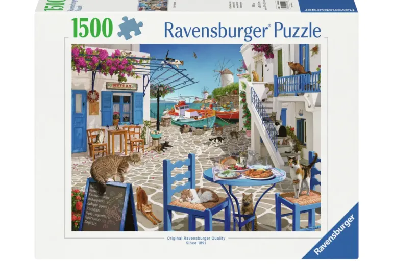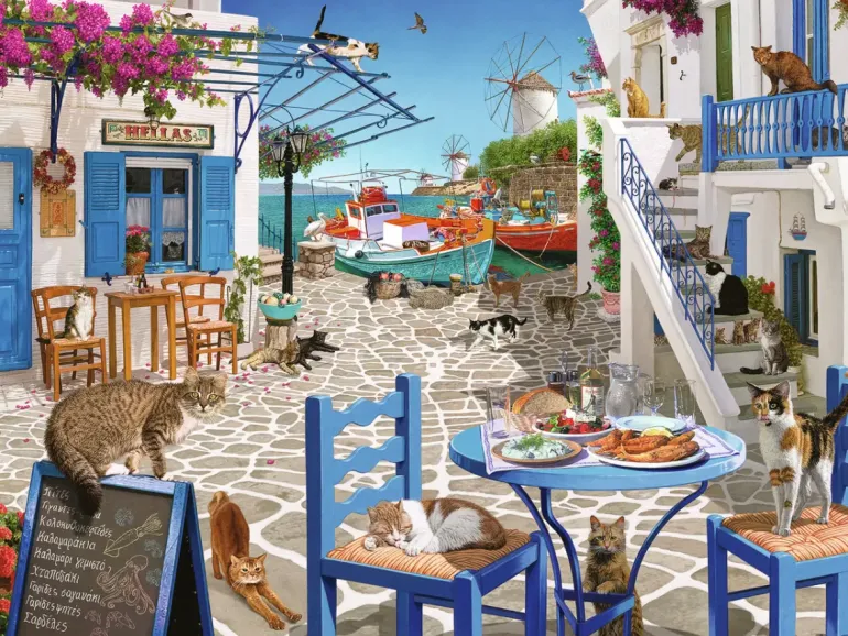 Det är en varm sommardag på den grekiska ön Mykonos i Egeiska havet, känd för sina vitkalkade husfasader, knall blå dörrar och praktfulla bougainvillea. Fiskebåtarna ligger förtöjda vid kajen och inga människor syns ännu till, så stadens alla katter passar på att ha en härlig stund tillsammans.