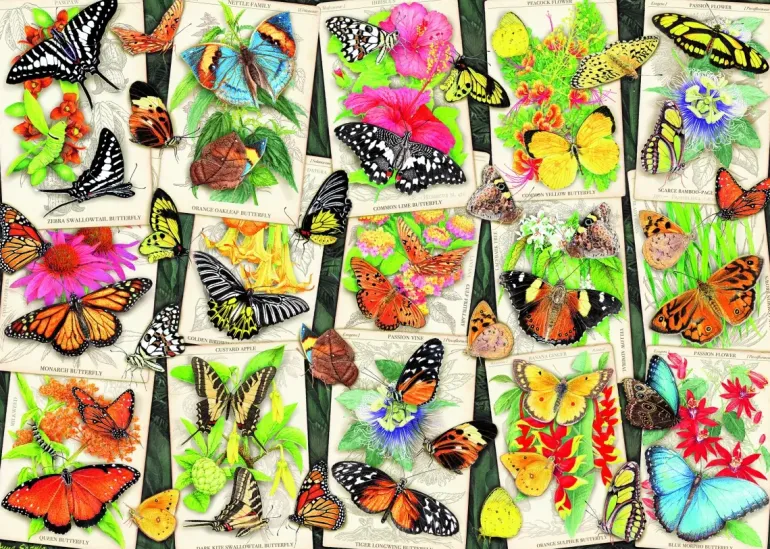 Ett kollage av olika tropiska fjärilar som sitter på vackert illustrerade kort som berättar mer om dem.