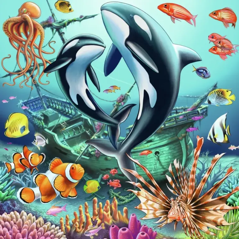 Tre pussel på 49 bitar vardera, med olika motiv från havet. Vi ser färgsprakande koraller, delfiner, sköldpaddor, späckhuggare och en stor rosa bläckfisk.