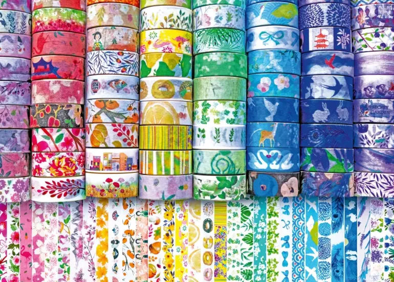 Ett färggrant kollage av ”Washi tape” med olika mönster. Med washi tejp kan man enkelt dekorera paket, klippböcker, kollage och anteckningsböcker.