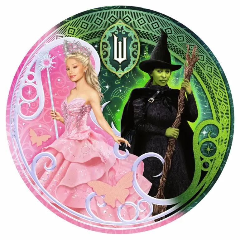 Ett runt pussel med motiv ur den musikalisk fantasyfilmen ”Wicked”, utgiven av Universal Pictures.
