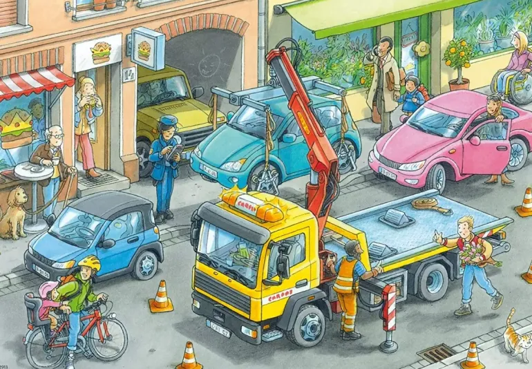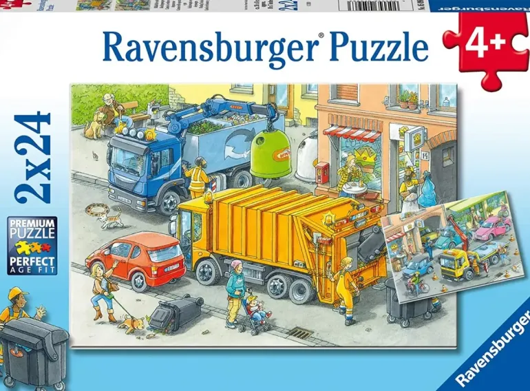 Två pussel på 24 bitar vardera, med olika motiv av tunga fordon i arbete i staden.