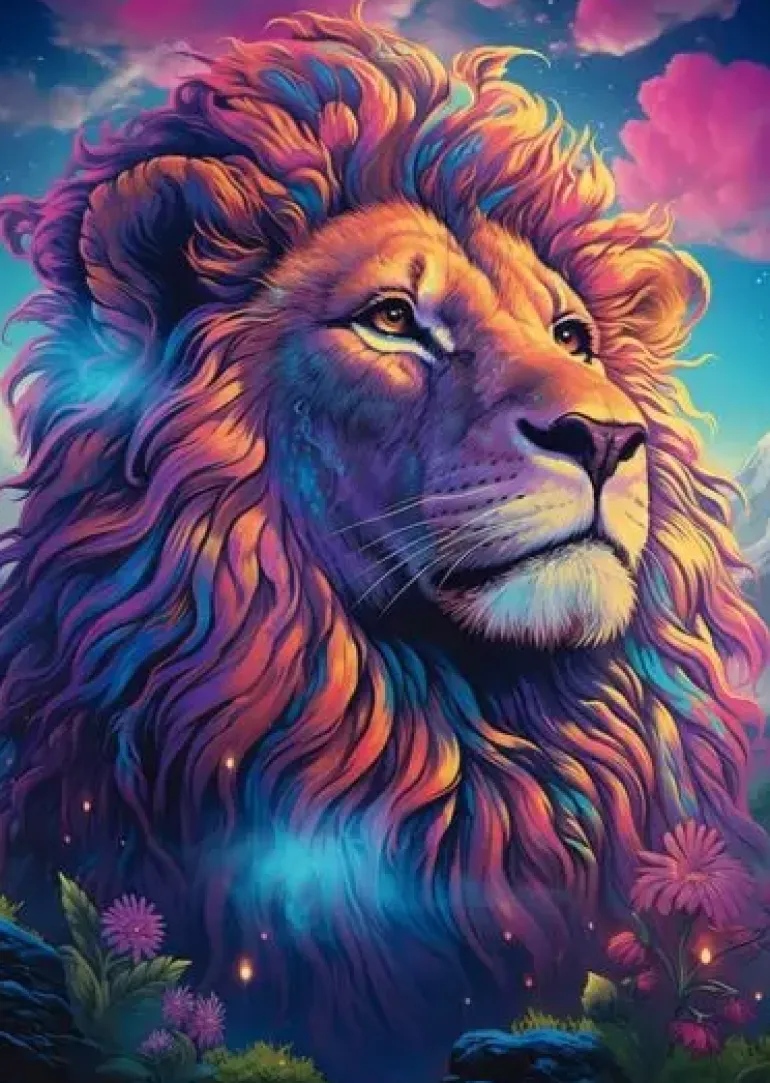En majestätisk lejonhanne med blicken fäst i fjärran omges av glödande eldflugor. Hans päls och man skimrar i varma färgtoner, i den blå himlen svävar rosa moln och i nedre delen av pusselmotivet ser vi stenar och blommor i grön mossa.