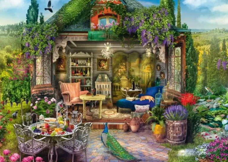 Ett lusthus ligger vackert beläget på en vingård, omgivet av vinrankor och praktfulla blommor i sprakande färger. Huset är inrett som en salong med mjuka möbler och en inbjudande bokhylla, här ligger en katt och vilar sig och på bordet står ett glas vin redo att avnjutas. Utanför är trädgårdsbordet uppdukat med läckerheter och påfågel spatserar över de vackert mönsterlagda kullerstenarna. Ett pussel att drömma sig bort i och en fröjd för ögat och själen, skapat av pusselmotivens okrönta drottning, Aimee Stewart.