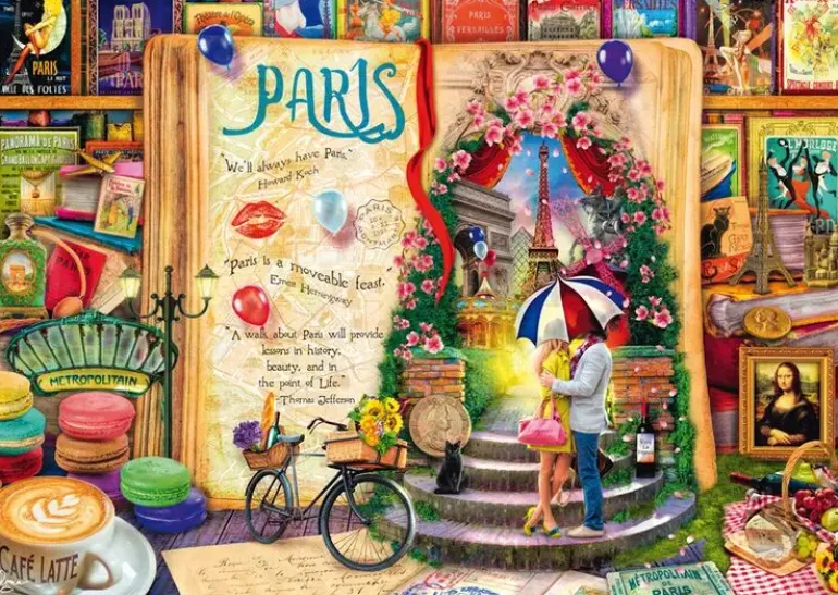 I det här pusselmotivet tar vi en tur på ”Memory Lane” till kärlekens stad Paris. Här syns mängder av guideböcker, posters från kända shower, en kopp café au lait, eiffeltornet, vin, ost, baguetter, konst makarons och annat som för tankarna till Frankrikes berömda huvudstad.