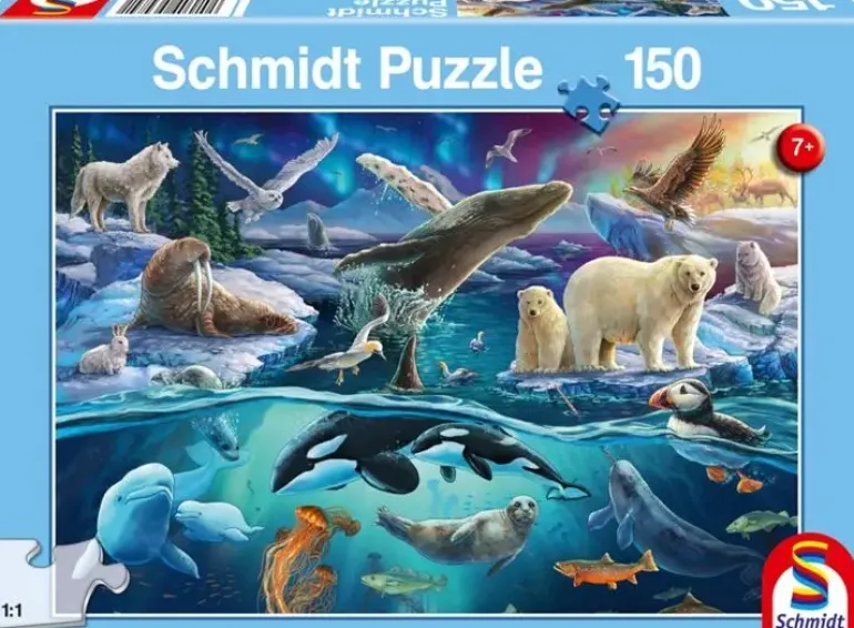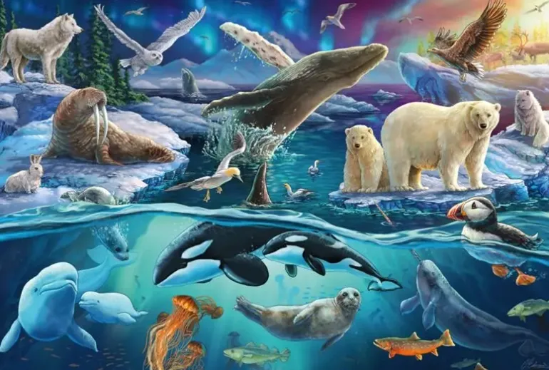 Ett livfullt kollage av djurarter som trivs i arktisk miljö, både ovan och under vattnet!