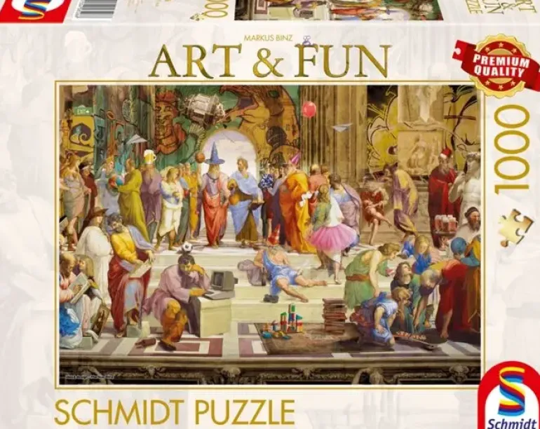 Detta motiv är en humoristisk version av muralmålningen ”Skolan i Aten” där många kända grekiska filosofer kan synas. Här har flera mer moderna objekt lagts till där de passar in i målningen!