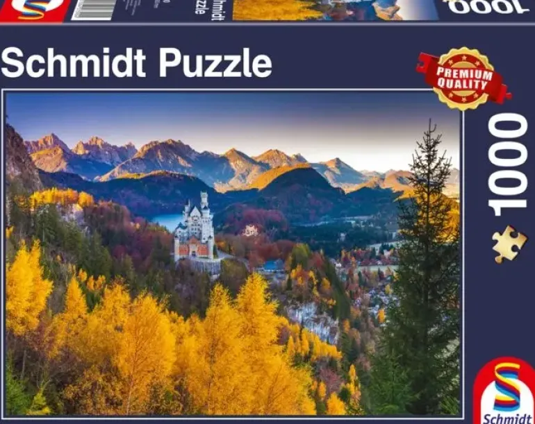 Det kända slottet Neuschwanstein i ett perspektiv som erbjuder pusslaren en härlig känsla av naturen runtomkring slottet. Trotts sin storlek ser slottet nästan litet ut där det står omgivet av skogar, en sjö och alperna i bakgrunden. Luften är klar och de gula löven skvallrar om att det blivit höst.