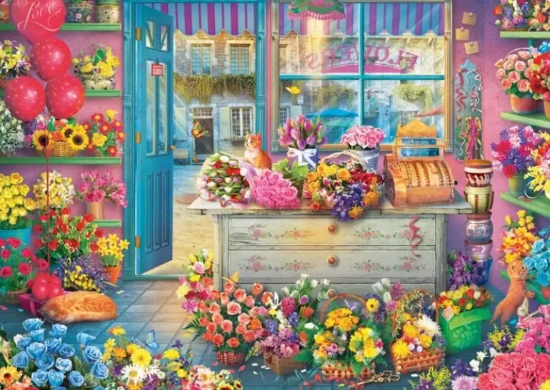 Denna blombutik är fylld till taket med vackra och färgglada blommor av olika typer! Bland dem hänger orangea katter som vilar, utforskar eller bara är.