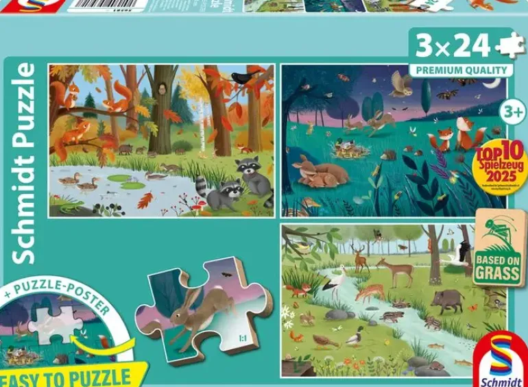 Tre pussel på 24 bitar vardera, med olika motiv av söta djur i skogen och på ängen!