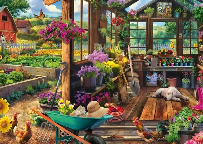 I ett charmigt trädgårdsskjul av trä har familjens hund lagt sig för att ta en tupplur i den vilsamma miljön. Här frodas blommorna och en mängd trädgårdsredskap finns till hands för den som är sugen på lite trädgårdsarbete. Utanför syns odlingsbäddar med grönsaker, en lada, en get och familjens höns som är ute och spatserar.
