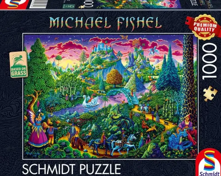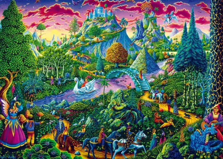 Ett fantasilandskap, sprängfyllt av färggranna detaljer, breder ut sig framför oss. Det här pusselmotivet innehåller verkligen allt man kan drömma om ur sagornas värld. Här finns tät grön skog, prinsar och prinsessor, trollkarlar, feer, bevingade hästar, tama björnar, drakar och slott.