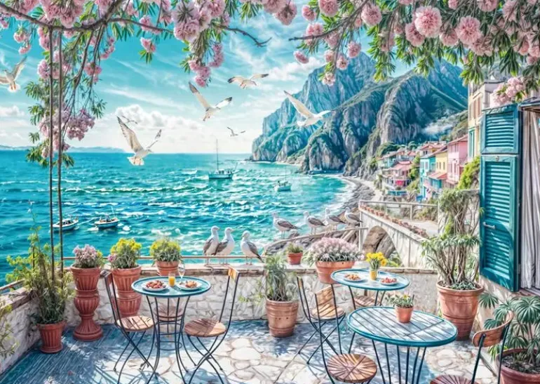 På en terrass någon stans vid medelhavet står borden dukade, men gästerna får nog skynda sig för ett gäng hungriga måsar har fått syn på de välfyllda tallrikarna! Från den fina terrassen i sten har man en fantastisk utsikt över det böljande turkosa havet, några båtar guppar på vågorna och till höger i motivet skymtar man färggranna husfasader och höga klippor. På terrassen finns växter och blommor i krukor och ett blommande träd erbjuder skön skugga.