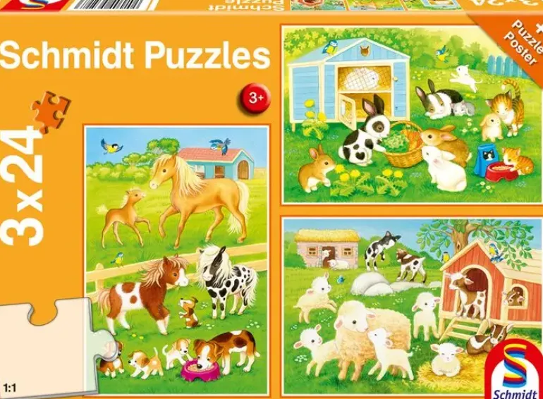 Tre pussel på 24 bitar vardera, med olika motiv av söta djur på bondgården!