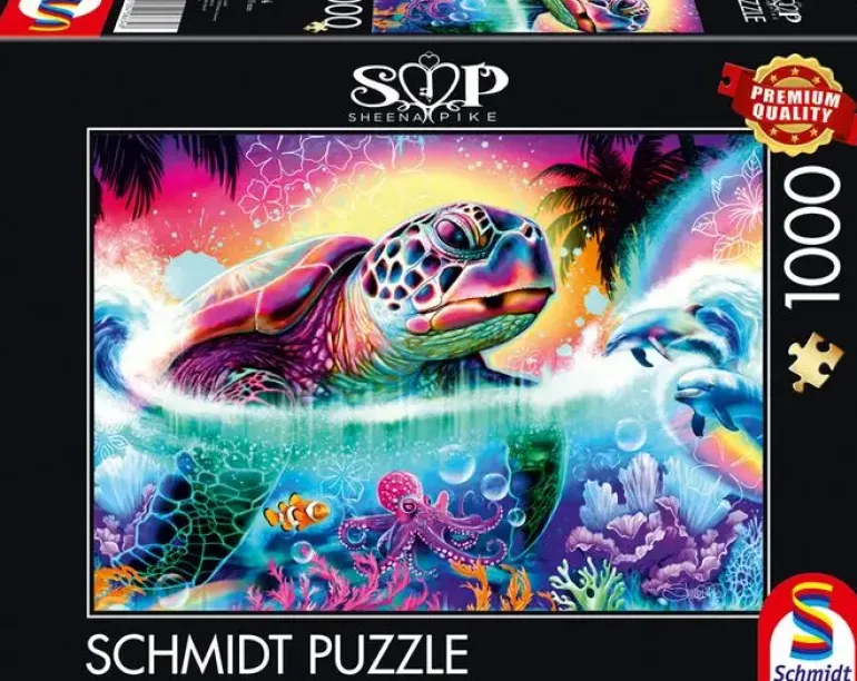 En stor havssköldpadda i neonfärger simmar fram i ett tropiskt hav. Den är omgiven av vatten och har sällskap av andra havsdjur, koraller och fiskar. I bakgrunden skymtas skuggor av palmer och en varm solnedgång. Ett färgsprakande pusselmotiv av illustratören Sheena Pike.