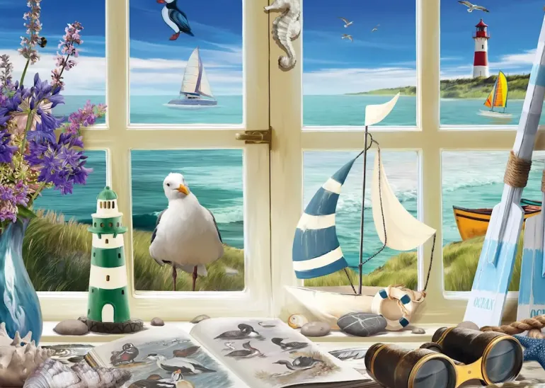 På skrivbordet finns en uppslagsbok över sjöfåglar, en kikare, maritima dekorationer i trä, en kikare och en vas med blommor i lila färgskala. En fiskmås har landat på fönsterblecket och tittar nyfiket in på alla fina strandfynd. I bakgrunden syns böljande gröna kullar, ett turkosblått hav, segelbåtar med spända segel och en klassiskt målad fyr i rött och vitt. Ett pussel med många fina detaljer som säkerligen blir en fröjd att pussla ihop!
