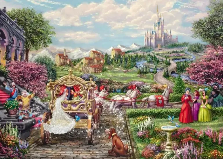 I det här pusselmotivet är Askungen och drömprinsen nygifta och har hoppat in i den utsmyckade vagnen för att åka iväg till ”lyckliga i alla sina dagar”.