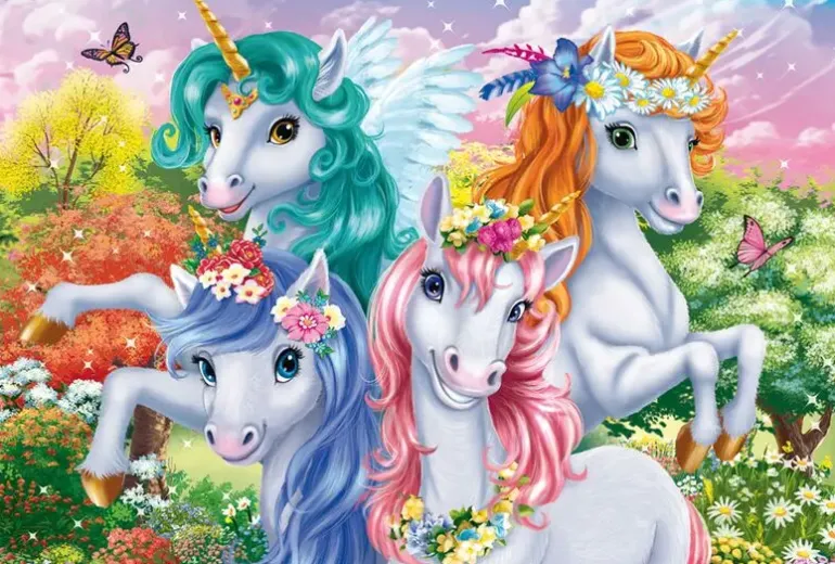 Ett gäng glada enhörningar har samlats för en gruppbild. Ett fantastiskt härligt och färgglatt pussel för alla som älskar enhörningar. Säg omelett!