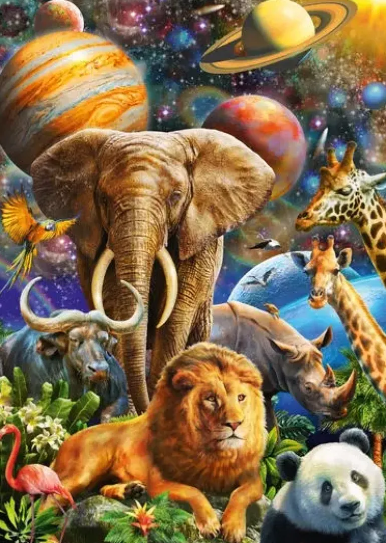 Fantasymotiv med olika typer av djur, i bakgrunden skymtar rymden med stjärnor och planeter.
