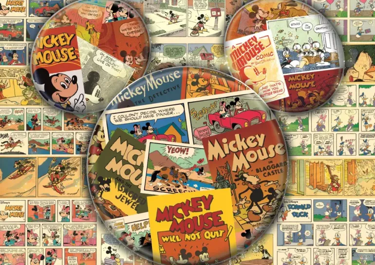 Ett härligt kollage av serietidningar med Musse Pigg i huvudrollen!