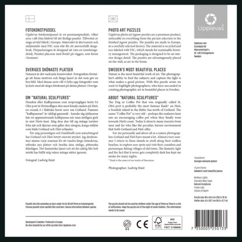 Upplevas vill i den här pusselserien höja fotografer som skapat fotokonst av olika platser i det vackra svenska landskapet. Speciellt fokus ligger på den naturliga belysningen och rätt motiv. Affisch medföljer.