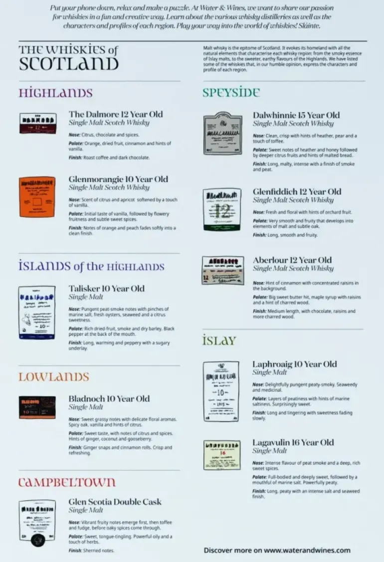Lär dig om whisky och om Skottlands historia och geografi, samtidigt som du lägger ett vackert pussel! I pusselkartongen ingår även en poster.