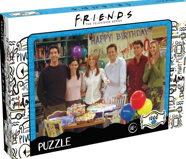 Vännerna i den världskända humor TV-serien ”Friends” har samlats för att fira en av vännernas födelsedag. Självklart finns det ballonger, paket och en stor tårta med ljus. Happy Birthday!