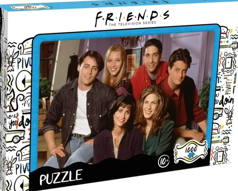 Vännerna i den världskända humor TV-serien ”Friends” har samlats för att ta en gruppbild i sin lägenhet. Säg omelett!