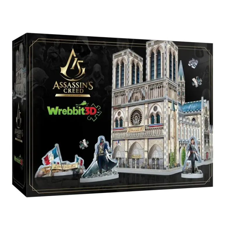 Ett detaljrikt 3D-pussel med 860 bitar, som föreställer Notre Dame-kyrkan från datorspelet Assassin’s Creed Unity, tillsammans med bekanta spelfigurer i pusselmodell.