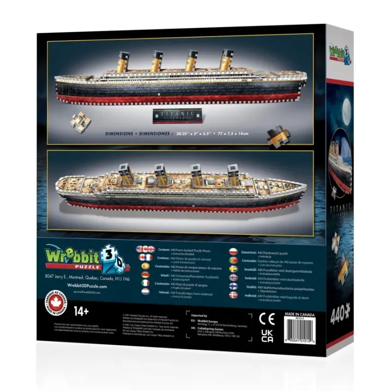 Cruise along an historical journey from Southampton to New York by assembling this 440-piece 3D jigsaw puzzle of the unforgettable RMS Titanic! One of three Olympic-class ocean liners, its size and luxury placed it at the forefront of transatlantic passenger transportation before the tragic collision with an iceberg in 1912 on its maiden voyage. Piece by piece, raise this archetypal ship from the depths of the past and reclaim its intended glory!